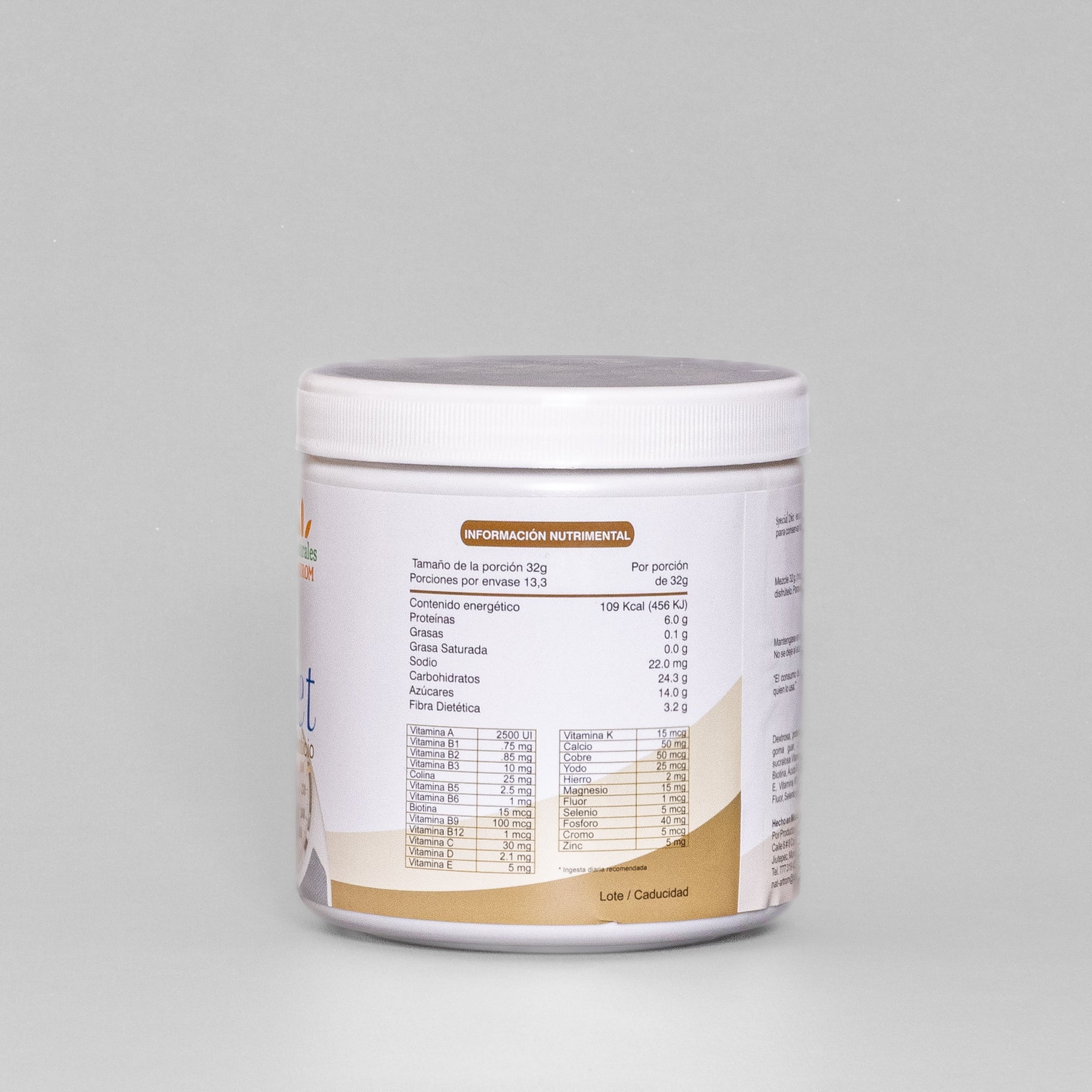 Ingredientes: Proteína aislada de soya, Leche descremada en polvo, Dextrosa, Carragenina, Goma Guar, Carboximetilcelulosa, Saborizantes naturales y artificiales, Sucralosa, Vitamina B1, Vitamina B2, Vitamina B3, Vitamina B6, Vitamina B5, Biotina, Ácido Fólico, Vitamina B12, Vitamina C, Vitamina A, Vitamina D3, Vitamina E, Vitamina K1, Calcio, Magnesio, Zinc, Hierro, Fosforo, Cobre, Colina, Yodo, Fluor, Selenio, Cromo.